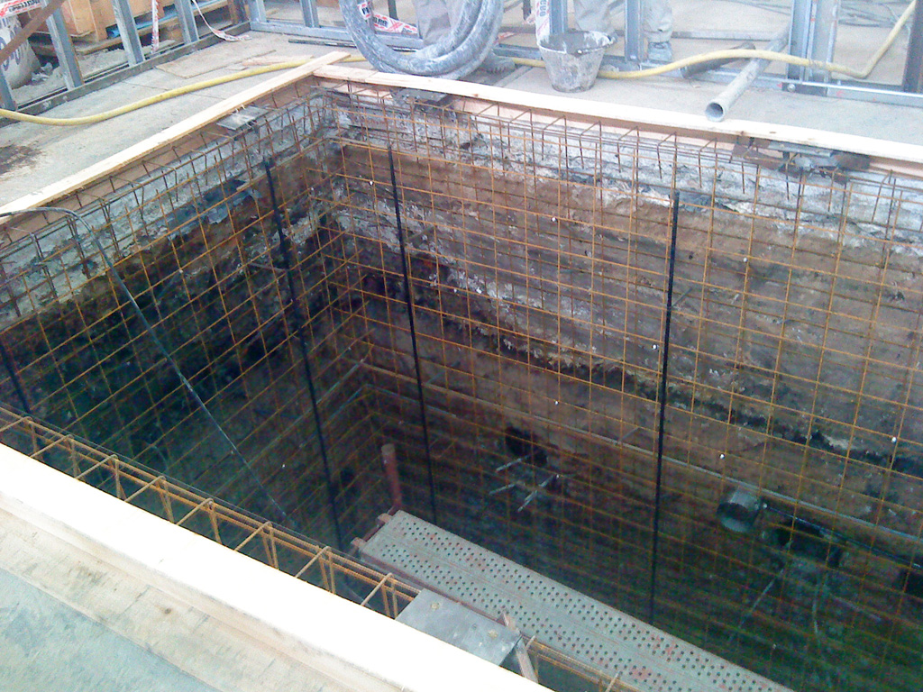 Se realizó una fosa de 6 metros de profundidad en el interior de la fábrica para el plegado del material. Se utilizó hormigón proyectado para la construcción de la misma.